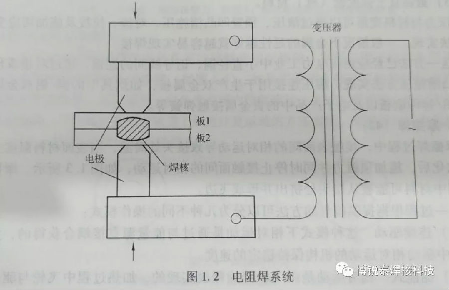 电站过程中虽然会在被连接材料的界面处产生熔化现象,但其仍然被定义为压焊,电阻点焊、电阻缝焊及电阻凸焊都基于相同的原理实现焊接:需要连接的材料被夹持在两个电极之间,然后施加大电流,如下图所示,接触表面的电阻热会导致局部的加热和熔化。电阻焊过程中一般施加短时大电流( 典型的为10000安培数量级),一般通电之前即施加压力并在电流撤销后仍保持片刻。